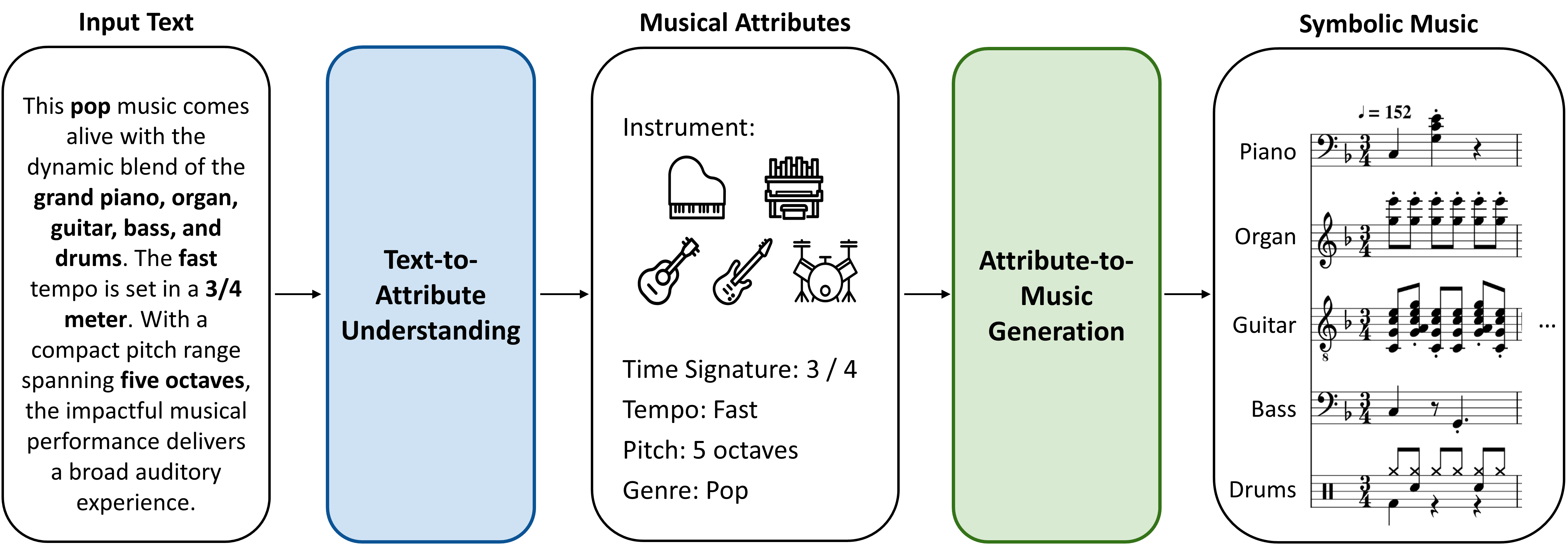 Figure 1: The two-stage framework of MuseCoco. Text-to-attribute understanding extracts diverse musical attributes, based on which symbolic music is generated through the attribute-to-music generation stage.